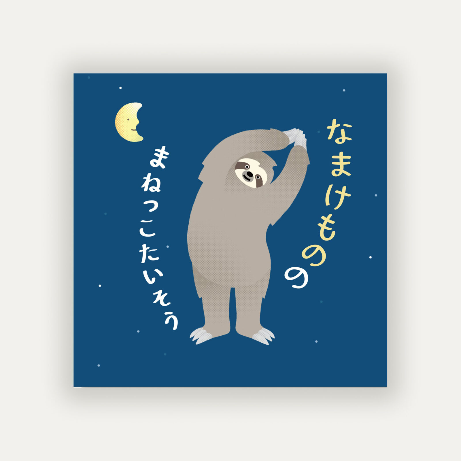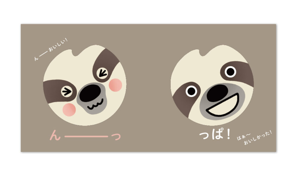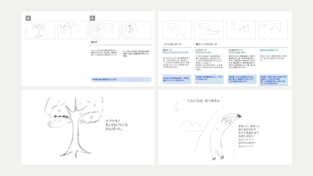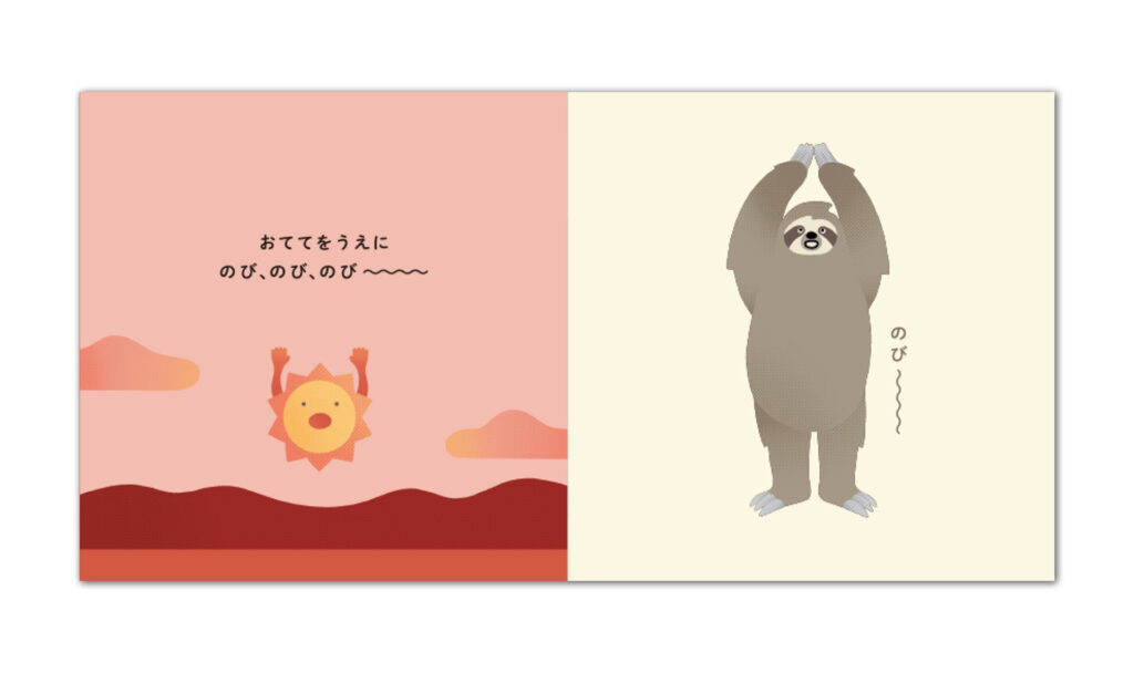 また、YASMOのオリジナル絵本である『なまけもののまねっこたいそう』の企画・構成を担当しました。主人公であるナマケモノが絵本内に登場するかわいいキャラクターをまねっこしているうちに眠ってしまうお話です。